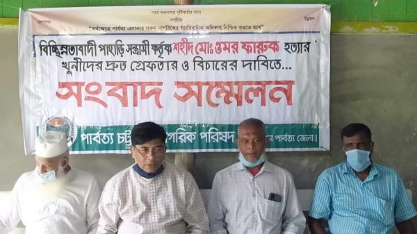সংবাদ সম্মেলনে এসময় পার্বত্য চট্টগ্রাম নাগরিক পরিষদের সভাপতি কাজী মো:মজিবর রহমান বলেন, বান্দরবানের রোয়াংছড়ি উপজেলার তুলাছড়ি মসজিদের ইমাম ওমর ফারুক হত্যার ঘটনায় এখনো কাউকে গ্রেফতার করা হয়নি আর পাহাড়ের শান্তি শৃংঙ্খলা ভঙ্গে কিছু সন্ত্রাসী এখনো তাদের কর্মকান্ড অব্যাহত রেখেছে। এসময় তিনি আরো বলেন,অবিলম্বে এই হত্যাকান্ডের ঘটনায় জড়িতদের গ্রেফতার করে দৃষ্টান্তমুলক শাস্তি প্রদান করতে হবে।