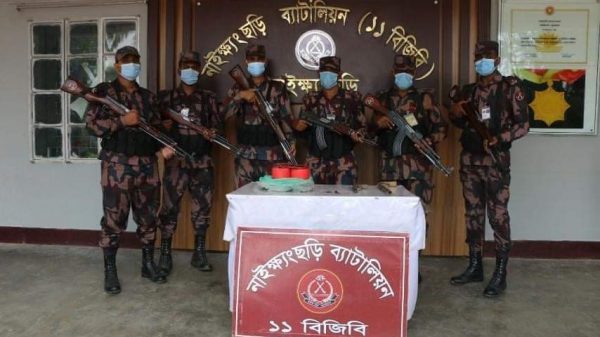 ১১বিজিবি সূত্রে,জানাজায়।সীমান্ত সুরক্ষা, চোরাচালান প্রতিরোধ, অবৈধ অনুপ্রবেশ, নারী ও শিশু পাচার রোধ ও অভ্যন্তরীণ সন্ত্রাস দমনে নাইক্ষ্যংছড়ি ব্যাটালিয়ন (১১ বিজিবি) শুরু থেকেই গুরুত্বপূর্ণ ভূমিকা পালন করে আসছে। এরই ধারাবাহিতকতায় অদ্য ০৬ জুলাই ২০২১ তারিখে আনুমানিক ০২০০ ঘটিকায় নাইক্ষ্যংছড়ি ব্যাটালিয়ন (১১ বিজিবি) র টহল দল গোপন সংবাদের ভিত্তিতে বড়বিল নামক স্থানে ২নং গর্জনীয়া ইউনিয়নের ১নং ওয়ার্ড জাকির হোসেন এর বাড়ীর পশ্চিম পার্শ্বে কিছু লোক ডাকাতি করার প্রস্তুতি নিচ্ছে। উক্ত সংবাদের ভিত্তিতে টহল দল বর্ণিত স্থানে গমন করলে বিজিবি টহল দলের উপস্থিতি টের পেয়ে দুস্কৃতিকারীরা কৌশলে পালিয়ে যায়। পরবর্তীতে বর্ণিত স্থানে আকাশমনি গাছের বাগান তল্লাশী করে দেশীয় তৈরি এলজি বন্দুক ০১টি, পিস্তল ০১টি (এলজি), বন্দুকের কার্তুজ ০৩ রাউন্ড এবং বিষ্ফোরক (দেশীয়)৩ কেজি ২০০ গ্রাম উদ্ধার করা হয়। উদ্ধারকৃত অস্ত্র ও বিষ্ফোরক রামু থানায় হস্তান্তর করার কার্যক্রম প্রক্রিয়াধীন।