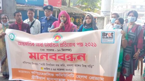 রাঙ্গামাটি প্রতিনিধিঃ আন্তর্জাতিক নারী নির্যাতন প্রতিরোধ পক্ষ উপলক্ষে বৃহস্পতিবার সকাল ১০ টায় উপজেলা কাপ্তাই সড়কে মানববন্ধন করা হয়েছে। চন্দ্রঘোনা খ্রীস্টিয়ান হাসপাতালের কমিউনিটি হেলথ প্রোগাম ওই মানববন্ধনের আয়োজন করা হয়েছে। কাপ্তাই আরো খবর