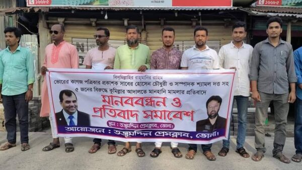 মোহাঃ নূরন্নবী তন্ময়,তজুমদ্দিন (ভোলা)প্রতিনিধি।।ভোরের কাগজের প্রকাশক সাবের হোসেন চৌধুরী ও সম্পাদক শ্যামল দত্তসহ পাঁচজন সাংবাদিকের বিরুদ্ধে কুমিল্লায় ১০ কোটি টাকার মানহানি মামলার প্রত্যাহারের দাবিতে ভোলার তজুমদ্দিন প্রেসক্লাবের উদ্যোগে মানববন্ধন কর্মসূচি আরো খবর